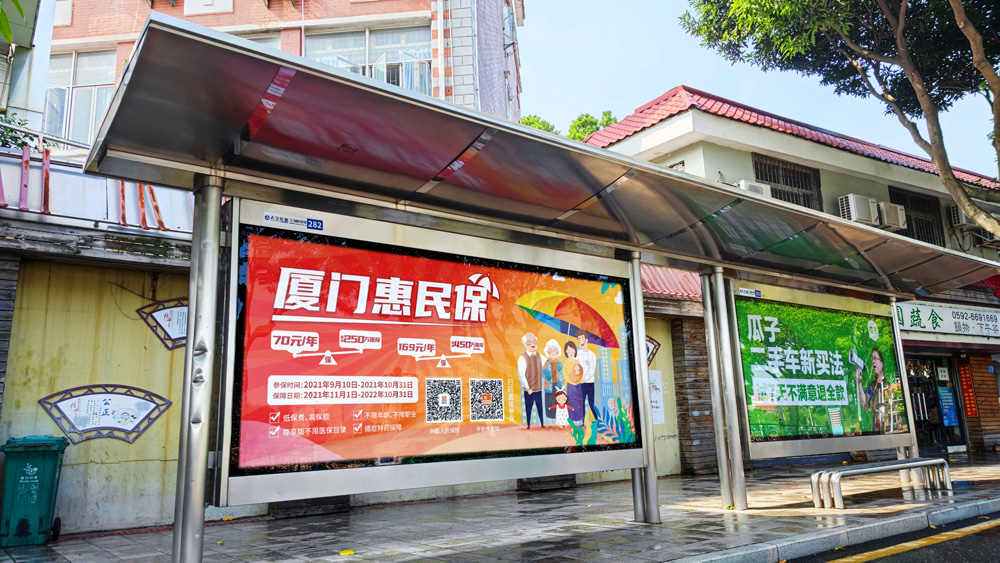 路牌及候車亭廣告畫(huà)面以“廈門惠民保”的四大優(yōu)勢(shì)以及參保二維碼(平安養(yǎng)老險(xiǎn)、中國(guó)人民保險(xiǎn))為主進(jìn)行宣傳,讓廈門人民在抗疫期間,多一份保障也多一份安心的守護(hù)。