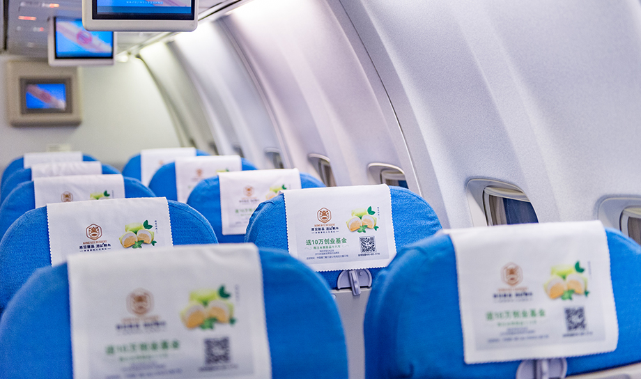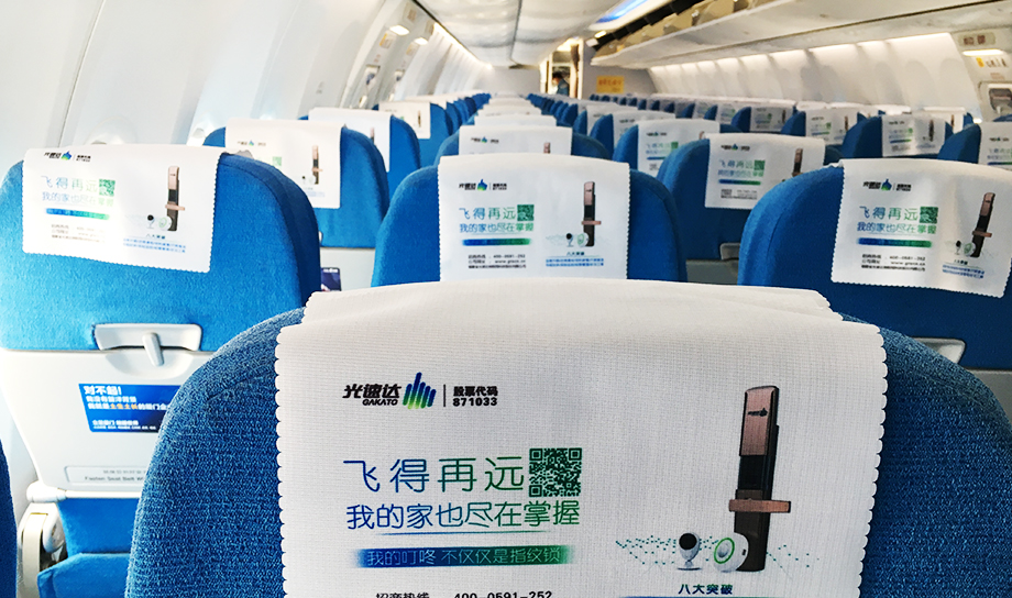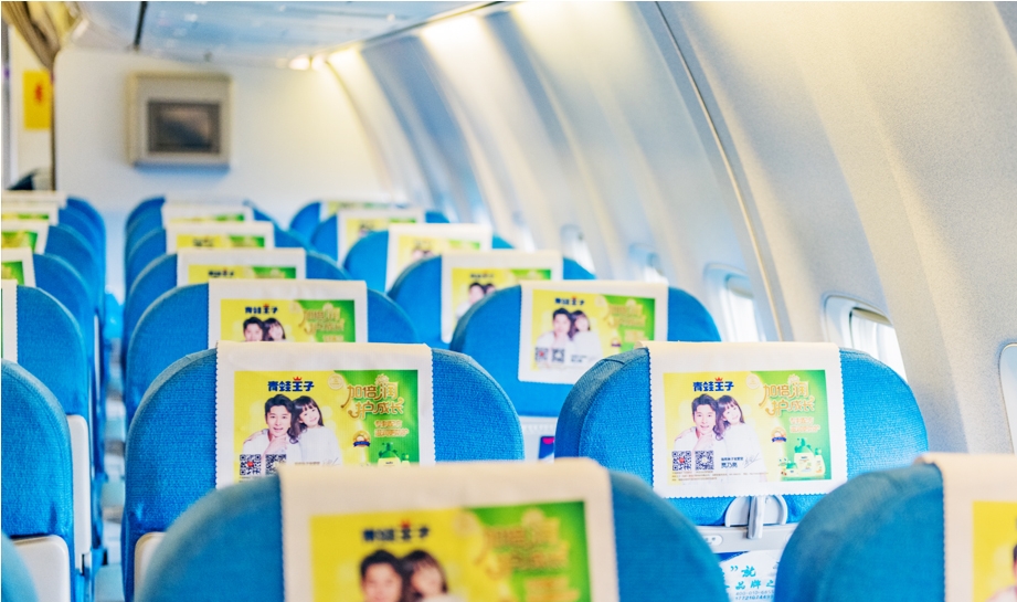 一進(jìn)入機(jī)艙,每個(gè)座椅上醒目統(tǒng)一的頭片廣告,全艙集中呈現(xiàn),營(yíng)造出一種沖擊力極強(qiáng)的視覺(jué)